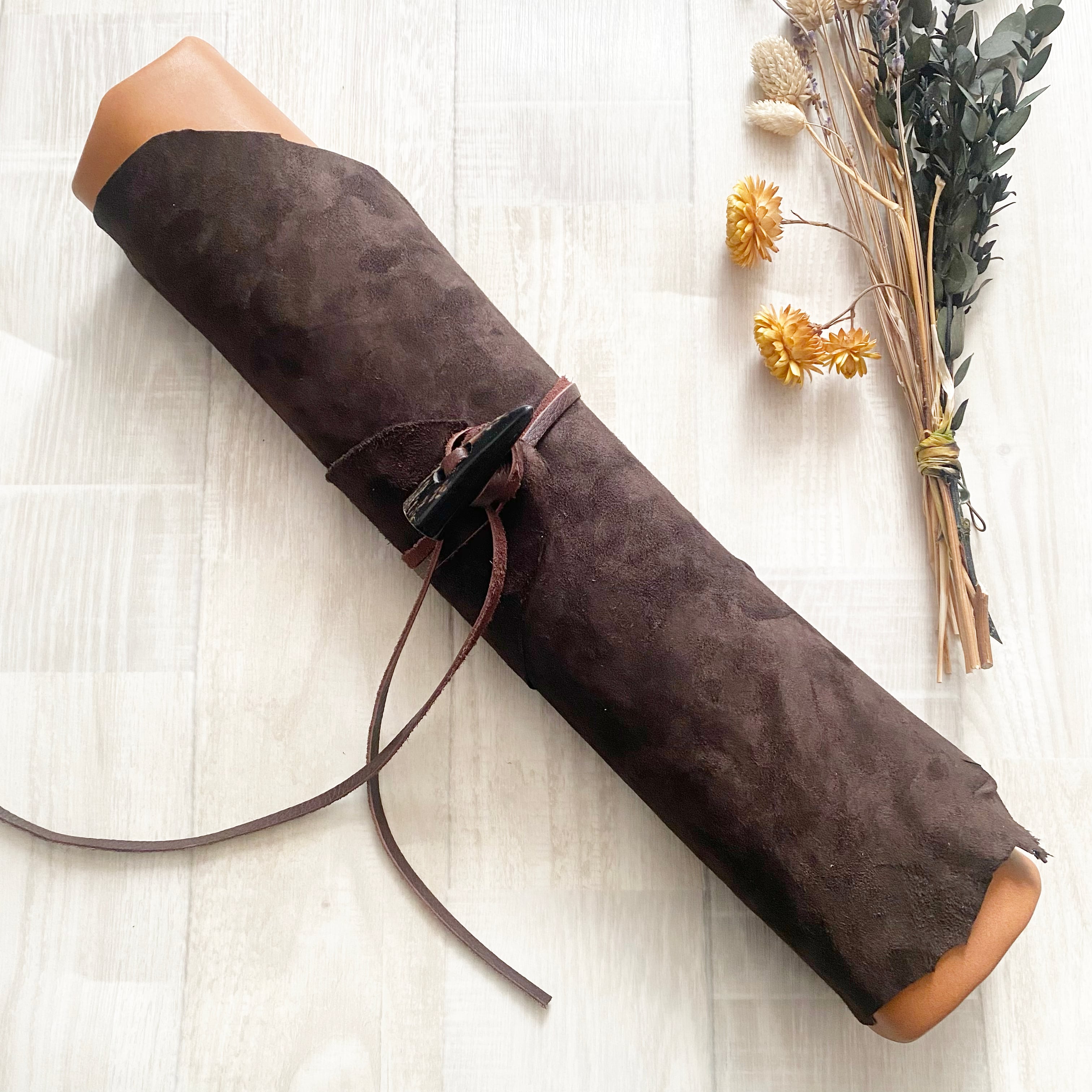 もっちりとした手触りとナチュラルな風合いが特徴の牛革で仕立てた、ロール式ドラムスティックバッグです。